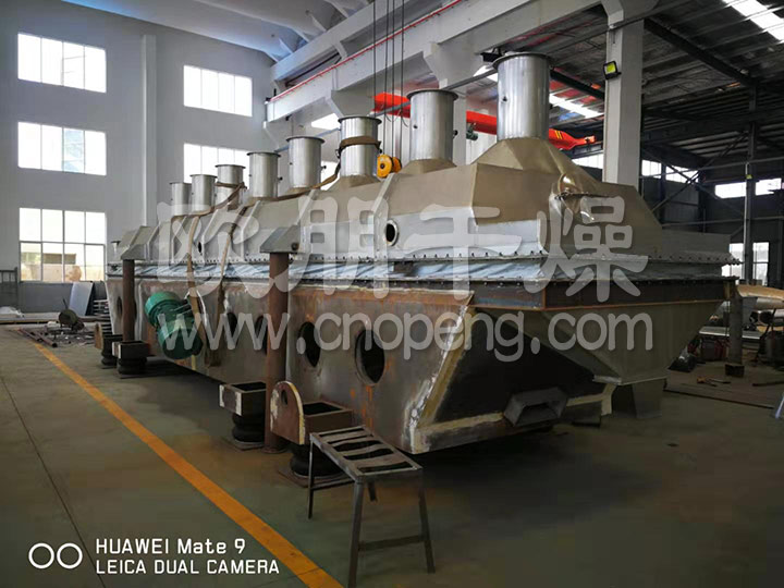 物料自进料进口进入机内,在振动力作用下,物料沿水平面流化床抛掷,向前连续运动,热风向上穿过流化床同湿物料换热后,湿空气经旋风分离器除尘后由排风1:3排出.干燥物料由排料进口排出。